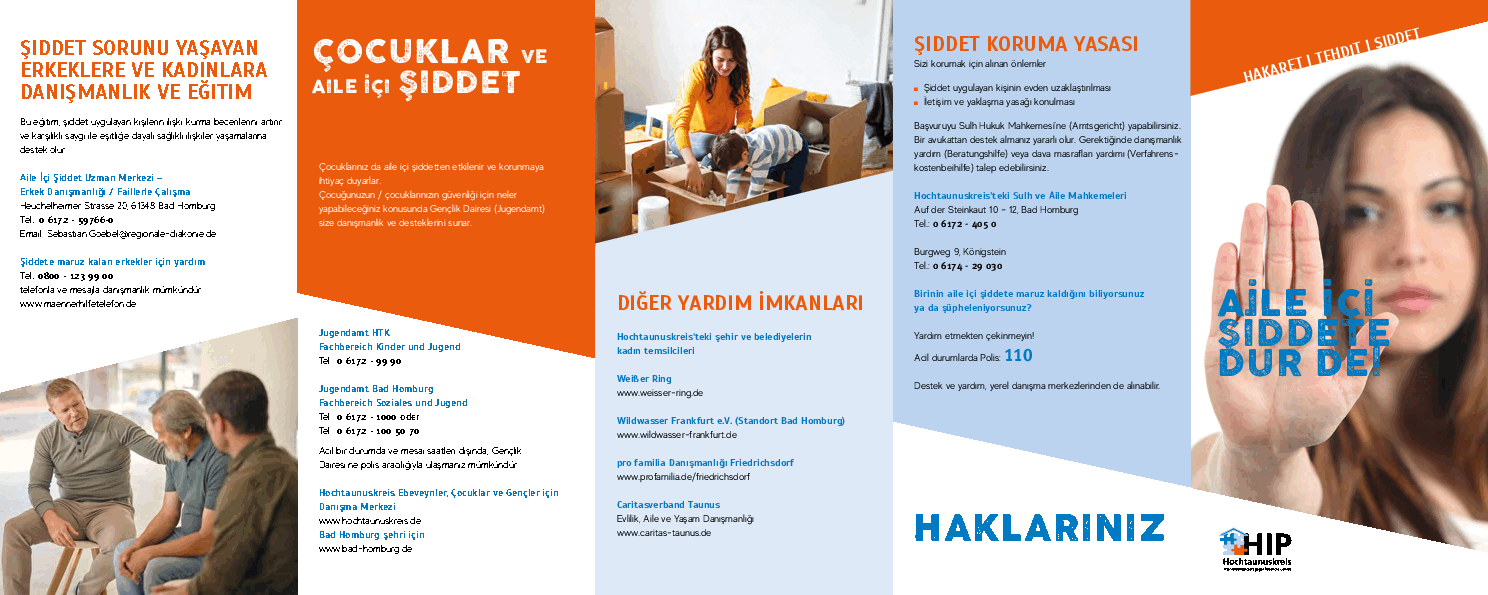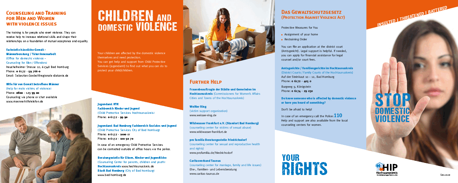 Der Arbeitskreis „Hochtaunuskreis Interventionsprojekt gegen häusliche Gewalt (HIP)“ gründete sich im Jahr 2000 auf Initiative von VertreterInnen des Vereins Frauen helfen Frauen HTK e.V. und der Polizei. Er hat das Ziel, alle Institutionen im Hochtaunuskreis, die mit häuslicher Gewalt befasst sind, zu vernetzen, um Betroffenen das bestmögliche Hilfeangebot zu bieten. Neben den Frauenunterstützungsorganisationen und der Polizei arbeiten im HIP VertreterInnen der Justiz, Jugendämter, Frauenbeauftragte sowie weitere Beratungsstellen und Institutionen zusammen.